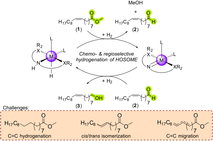Die selektive Hydrierung von Fettsäuremethylestern (1) zu ungesättigten Fettalkoholen (3) stellt einen Schlüsselprozess in der chemischen Industrie dar, da die daraus resultierenden Produkte als wichtige Rohstoffe für umweltfreundliche Tenside, Kosmetika und biobasierte Polymere dienen. Um diese Umwandlung zu erreichen, sind jedoch sorgfältig konzipierte Katalysatorsysteme erforderlich, die die Hydrierung der C=O Bindung ermöglichen, während die C=C Doppelbindungen ohne Hydrierung, Migration oder Isomerisierung erhalten bleiben. Für die selektive Hydrierung von Methyloleat zu Oleylalkohol sind nur wenige homogene Katalysatoren bekannt, die hauptsächlich auf Mangan oder Ruthenium basieren, und viele erfordern eine aufwendige Synthese. Hier war es unser Ziel, einen homogen-katalytischen Ansatz unter Verwendung handelsüblicher Katalysatoren zu entwickeln, um Oleylalkohol mit Reinheiten über 90 % aus HOSOME herzustellen.